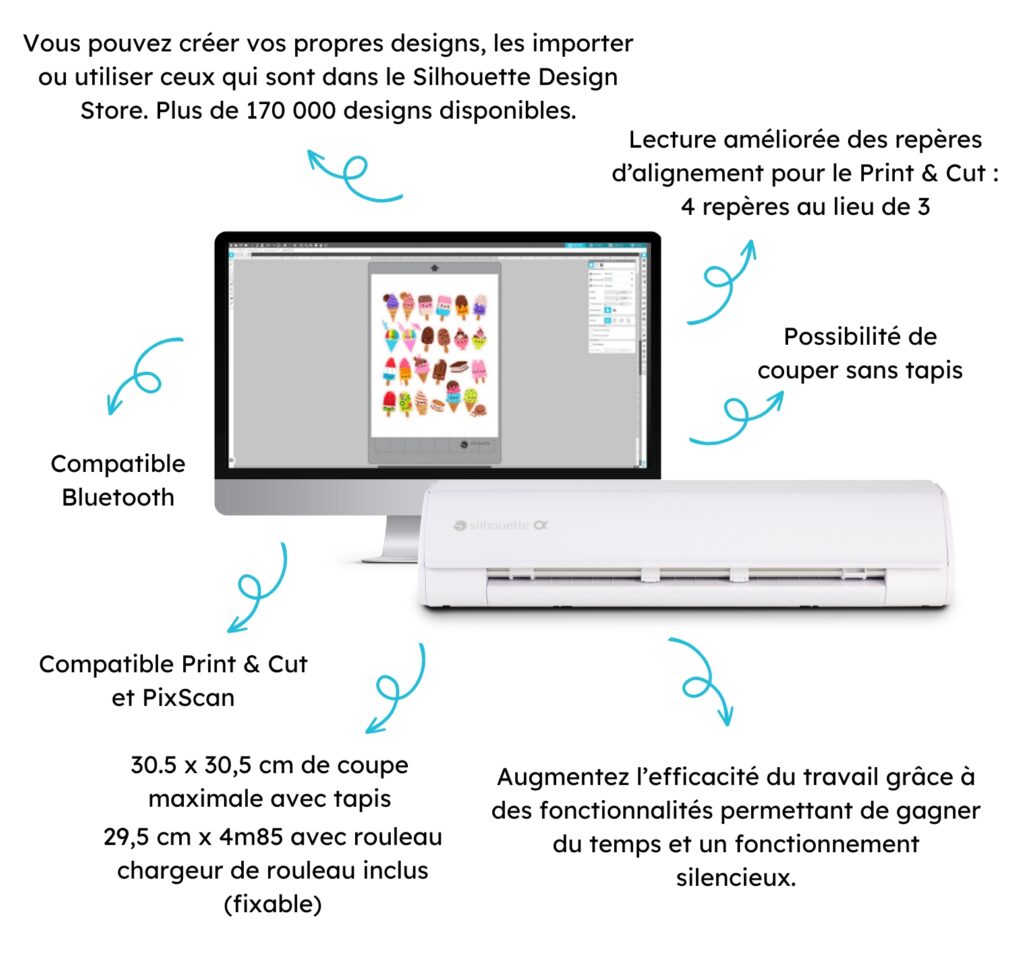 - Piloté par Silhouette Studio® , logiciel de conception illimité pour personnaliser vos projets.